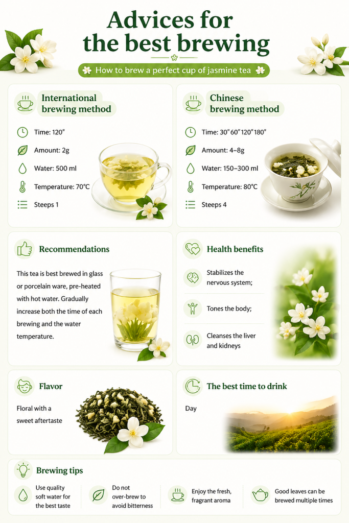 For the production of Moli Feng Yan, only the upper leaves are picked from the tea bush, and then they are twisted into small bundles, sometimes intertwined with Jasmine flowers. But even still, this tea acquires its unique Jasmine flavor the tea during the drying process, in which Jasmine flowers are laid out next to the tea leaves. Usually, this not only includes Jasmine. Lilies and some other flowers are used to flavor this variety. Thus, the tea leaves absorb the fragrance of each flower.